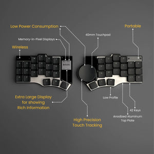 beekeeb Toucan キーボードは、低消費電力メモリ液晶ディスプレイとタッチパッドを一体化した分割型キーボードで、人気のPiantor 配列を基に設計されています。仕事や旅行などの外出先でも手軽に持ち運べるようデザインされており、機内でも快適に使用できる、携帯性に優れたキーボードを目指しています。