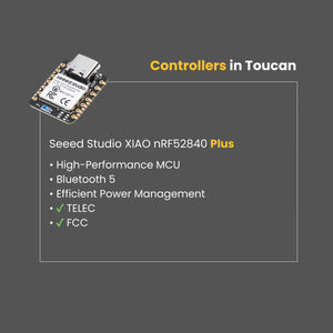 Toucan は最新の Seeed Studio XIAO nRF52840 Plus コントローラーを搭載し、iPad やノートパソコン、デスクトップ PC と Bluetooth で接続できます。Prospector などの Bluetooth ドングルともペアリング可能です。